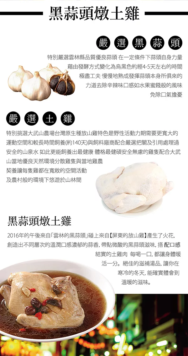 【台灣在地ㄟ尚好】黑蒜頭燉土雞禮盒:精選雲林黑蒜頭,搭配土雞一起燉煮,每喝一口,都讓身體暖活一分,禮盒包裝,讓你送禮自用兩相宜。