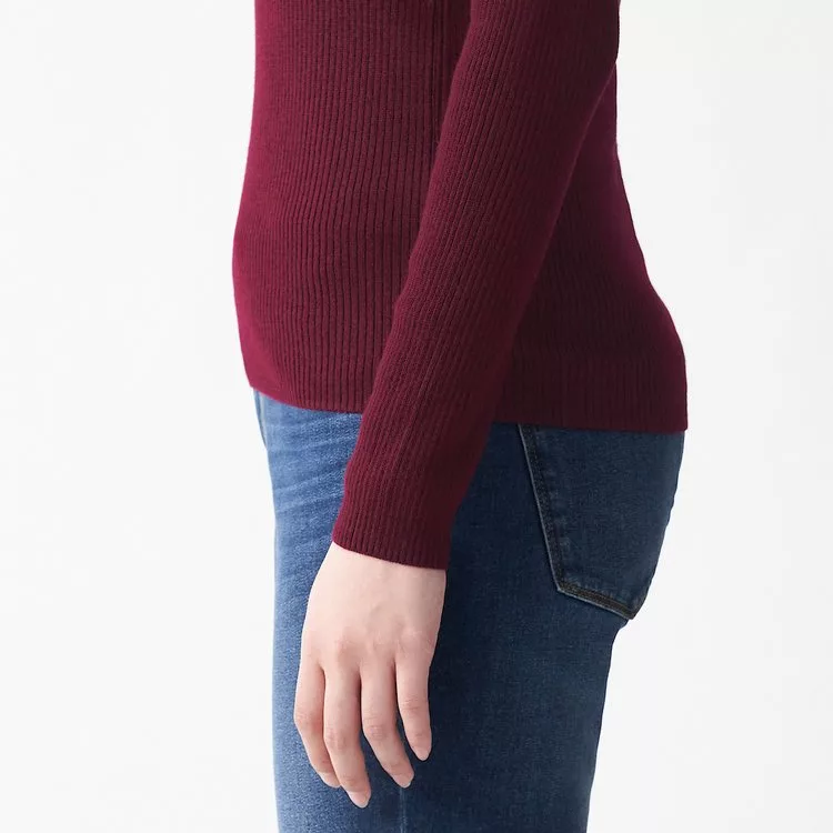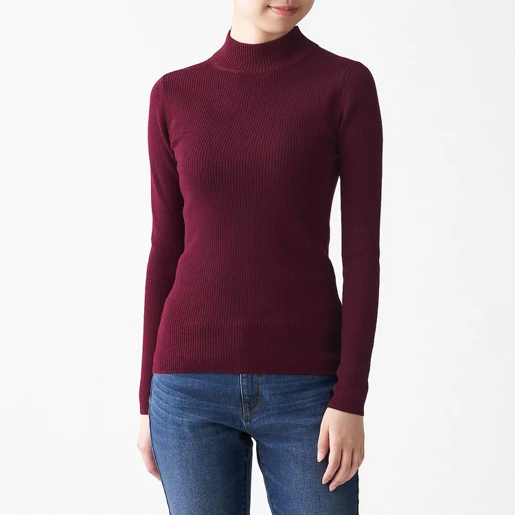 商品說明: [MUJI無印良品]女不易刺癢羊毛螺紋可水洗半高領針織衫S酒紅
