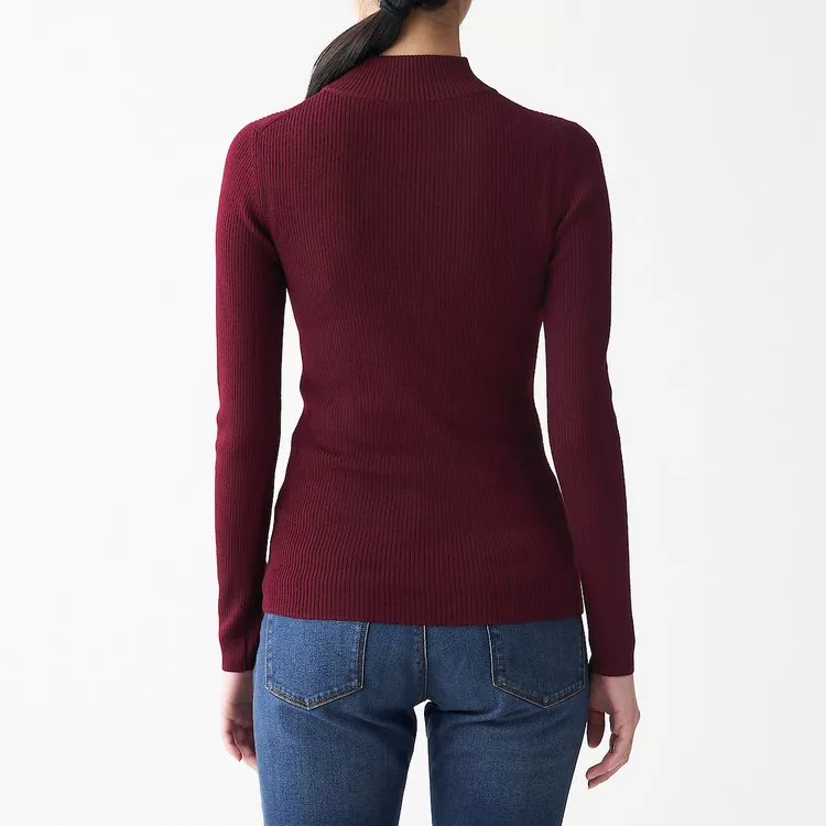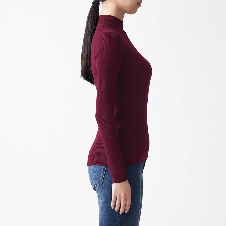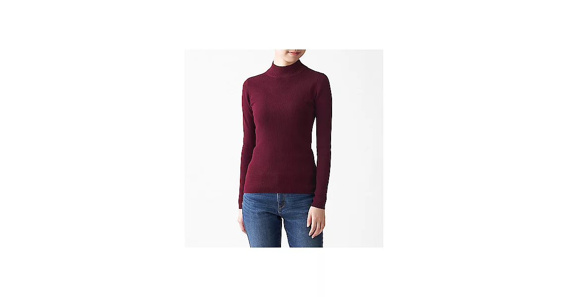 網路買無印良品商品推薦-[MUJI無印良品]女不易刺癢羊毛螺紋可水洗半高領針織衫S酒紅網路便宜購買推薦