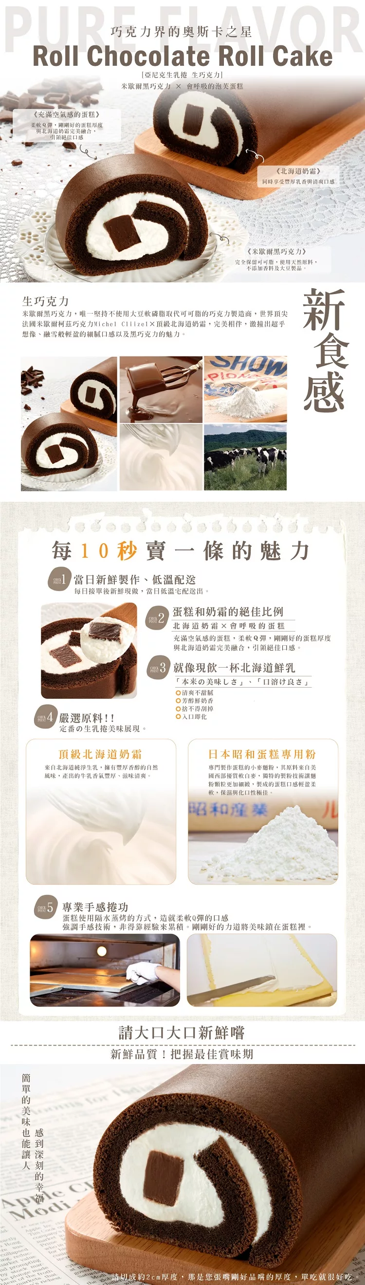 100%使用日本北海道奶霜,再搭配上日本昭和麵粉製成的泡芙蛋糕,以1:1黃金比例引領絕佳平衡口感,重現(超越)北海道原汁原味的生乳捲。 就像現飲一杯來自北海道香醇又新鮮的鮮奶。 和柔軟Q彈的泡芙蛋糕完美融合,在嘴裡很快就化開,嚐過一口就能完全領略日本人對北海道奶霜的熱愛。 |