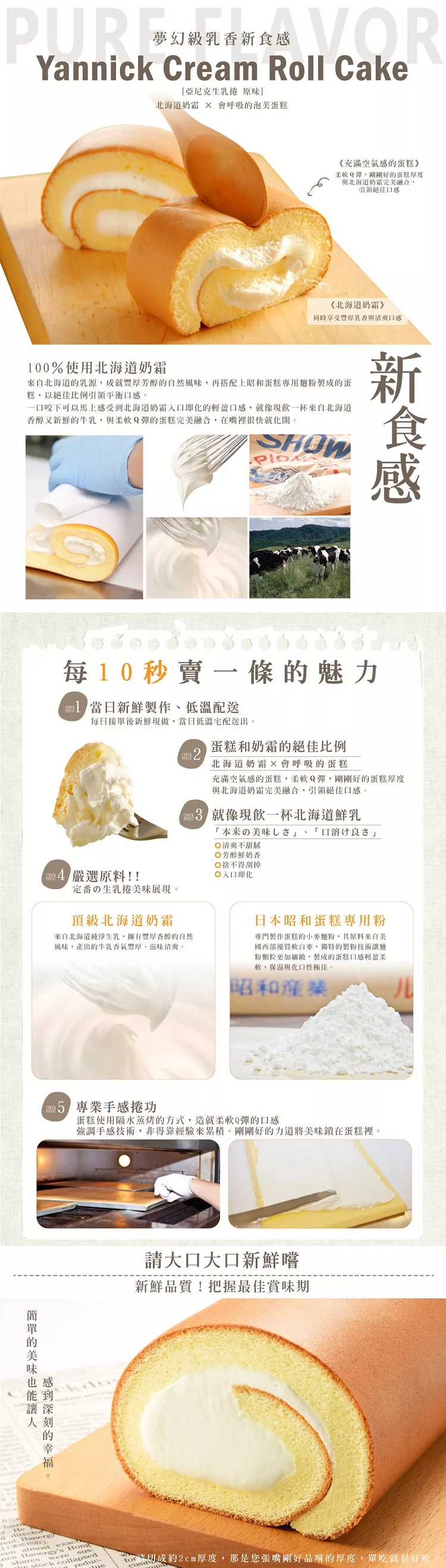 100%使用日本北海道奶霜,再搭配上日本昭和麵粉製成的泡芙蛋糕,以1:1黃金比例引領絕佳平衡口感,重現(超越)北海道原汁原味的生乳捲。 融雪般入口即化的輕盈口感,就像現飲一杯來自北海道香醇又新鮮的鮮奶。 和柔軟Q彈的泡芙蛋糕完美融合,在嘴裡很快就化開,嚐過一口就能完全領略日本人對北海道奶霜的熱愛。 |