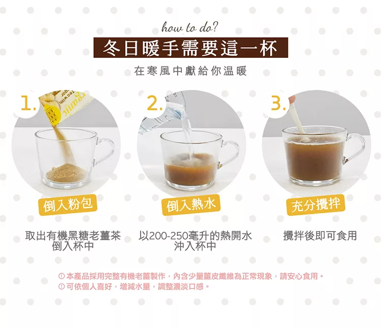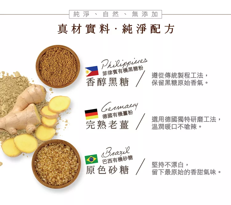 商品描述: 完熟有機老薑~暖口不嗆辣特別採用有機栽培的完熟老薑調配特濃有機黑糖,完美呈現完熟老薑的暖口不嗆辣及濃郁黑糖風味,為最佳冬季溫暖飲品,適合全家安心食用。 【米森御膳房】1.取出有機黑糖老薑茶,直接倒入杯中。 2.以200~250毫升的熱開水沖入杯中。 3.充分攪拌後,即可飲用。 ※可依個人喜好,增減水量,調整濃淡※產品內容物與規格說明/保固資訊:品名:【米森】有機黑糖老薑茶原料:有機黑糖粉(菲律賓……