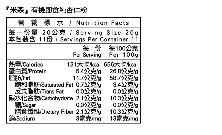 博客來-【米森】有機即食純杏仁粉(220g 罐)訂購網址: https://www.books.com.tw/exep/assp.php/87926/products/N001226002?utm_source=87926&utm_medium=ap-books&utm_content=recommend&utm_campaign=ap-202002